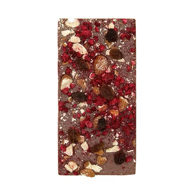 Cremige Milchschokolade mit fruchtigen Himbeeren, süßen Rosinen und knackigen Mandeln. Ein vielseitiger Genuss mit ausgewogener Balance von Frucht und Nuss.