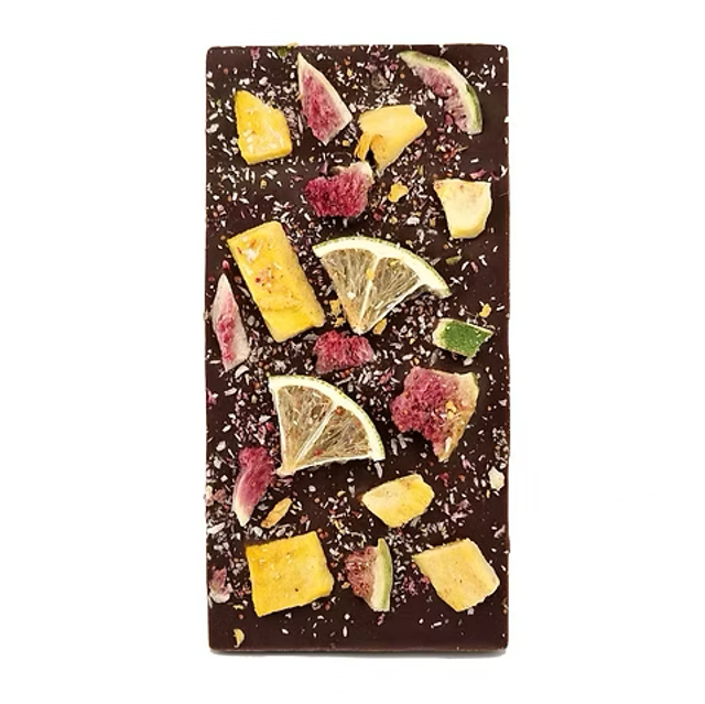 Exotische Früchte und cremige Milchschokolade vereinen sich zu einer tropischen Komposition. Mango, Erdbeere, Orange und Kokos verleihen dieser Schokolade ein unverwechselbares Sommeraroma.
